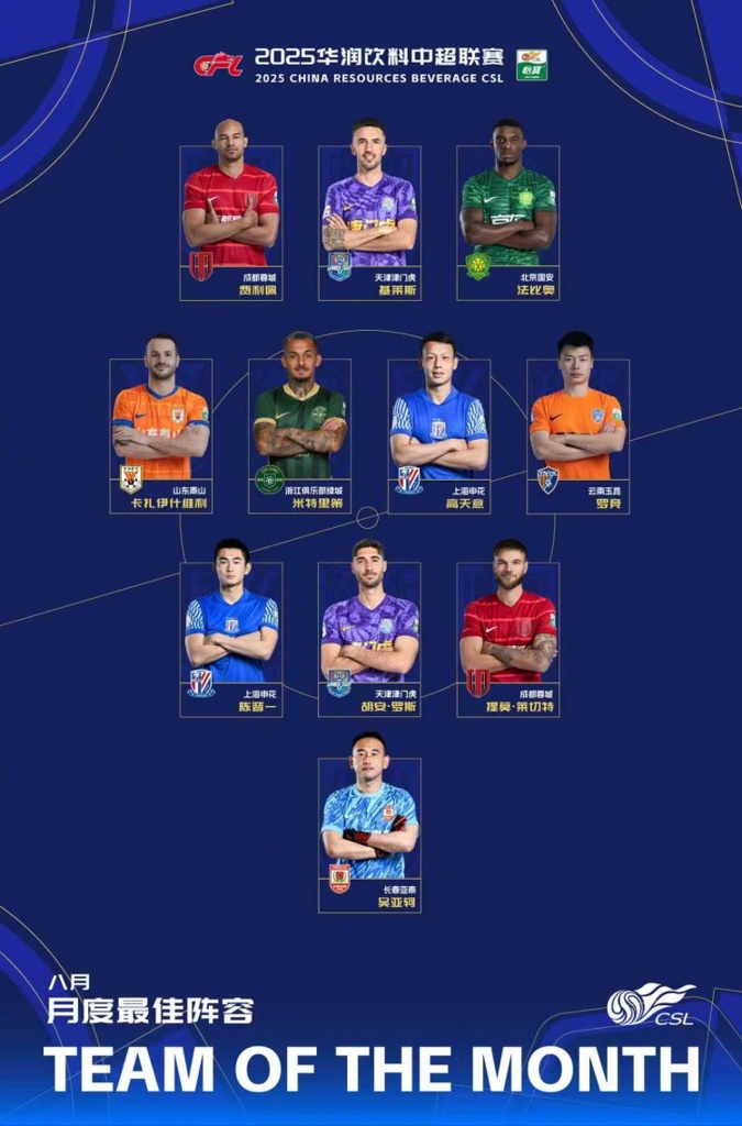 9月26日讯 中超官方公布8月最佳阵容,费利佩、瓦科在列,陈晋一、高天意、罗竞、吴亚轲入围,蓉城、申花、津门虎各有2位球员。